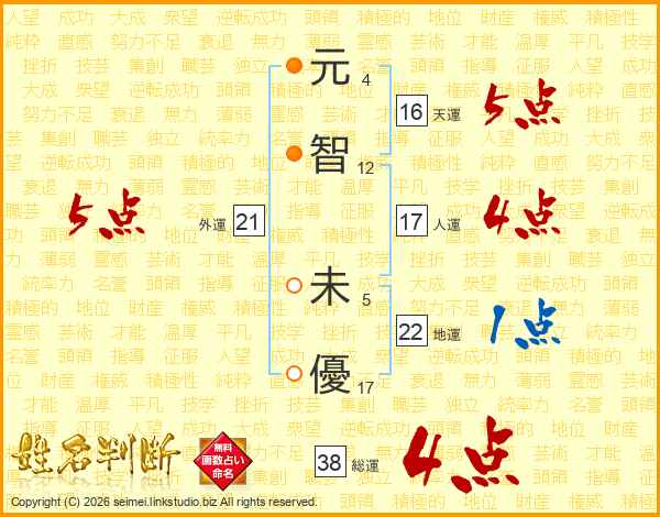 生活面を象徴する運勢です。外部から受ける影響力を表し、結婚運、家庭運や職場、環境への順応性を表します。総運から人運を引いた画数。姓や名が1文字の場合を除く。