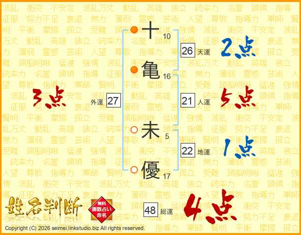 十(10画)亀(16画) 未(5画)優(17画)