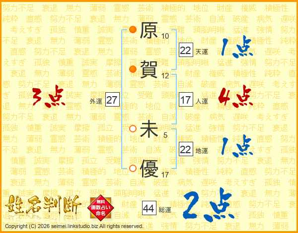 原(10画)賀(12画) 未(5画)優(17画)