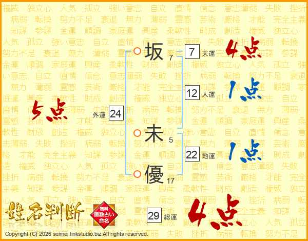 坂(7画) 未(5画)優(17画)