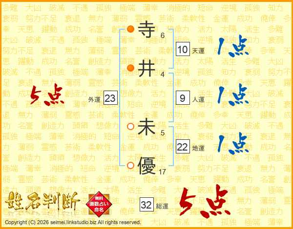 生活面を象徴する運勢です。外部から受ける影響力を表し、結婚運、家庭運や職場、環境への順応性を表します。総運から人運を引いた画数。姓や名が1文字の場合を除く。