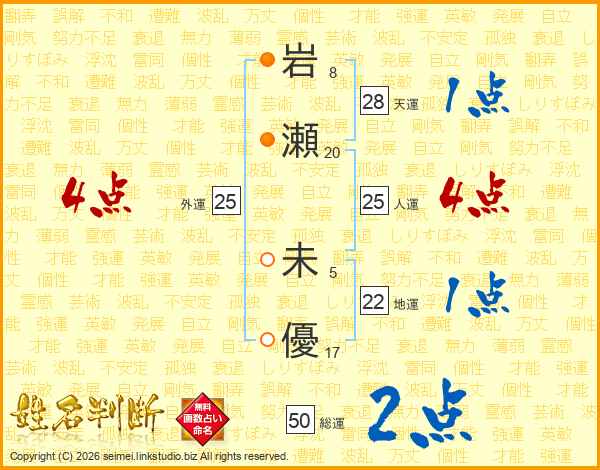 岩(8画)瀬(20画) 未(5画)優(17画)