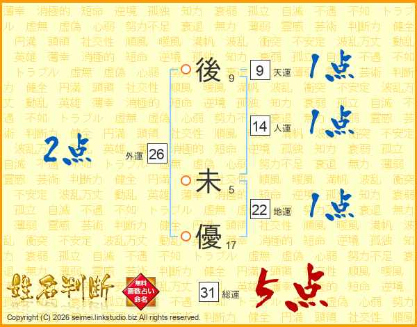 生活面を象徴する運勢です。外部から受ける影響力を表し、結婚運、家庭運や職場、環境への順応性を表します。総運から人運を引いた画数。姓や名が1文字の場合を除く。