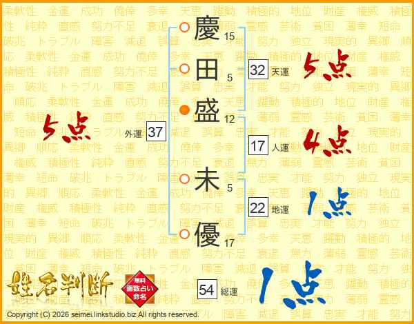 慶(15画)田(5画)盛(12画) 未(5画)優(17画)