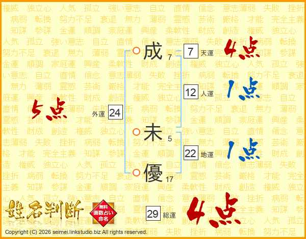 生活面を象徴する運勢です。外部から受ける影響力を表し、結婚運、家庭運や職場、環境への順応性を表します。総運から人運を引いた画数。姓や名が1文字の場合を除く。