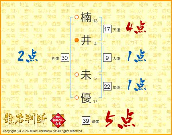 生活面を象徴する運勢です。外部から受ける影響力を表し、結婚運、家庭運や職場、環境への順応性を表します。総運から人運を引いた画数。姓や名が1文字の場合を除く。