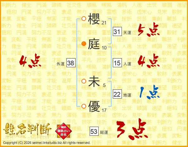 櫻(21画)庭(10画) 未(5画)優(17画)