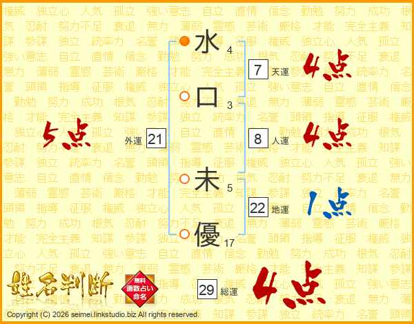 水(4画)口(3画) 未(5画)優(17画)
