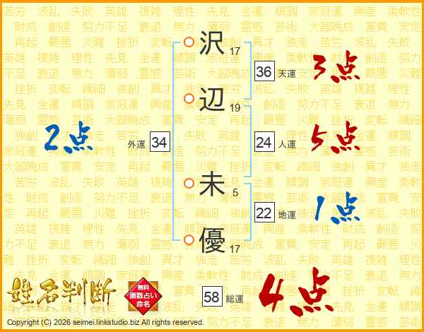 生活面を象徴する運勢です。外部から受ける影響力を表し、結婚運、家庭運や職場、環境への順応性を表します。総運から人運を引いた画数。姓や名が1文字の場合を除く。