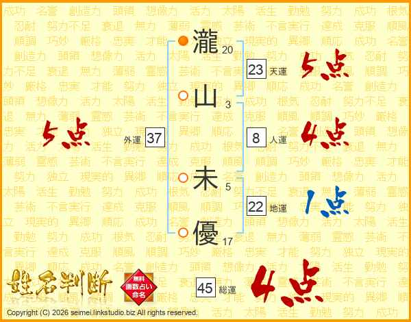 瀧(20画)山(3画) 未(5画)優(17画)