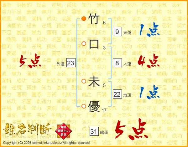 竹(6画)口(3画) 未(5画)優(17画)