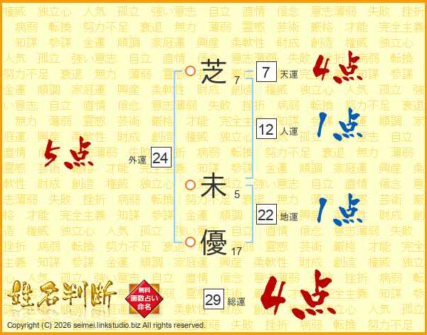 生活面を象徴する運勢です。外部から受ける影響力を表し、結婚運、家庭運や職場、環境への順応性を表します。総運から人運を引いた画数。姓や名が1文字の場合を除く。