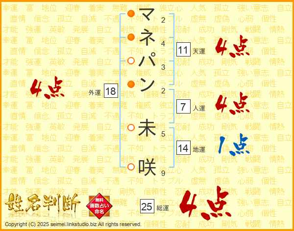 マ(2画)ネ(4画)パ(3画)ン(2画) 未(5画)咲(9画)