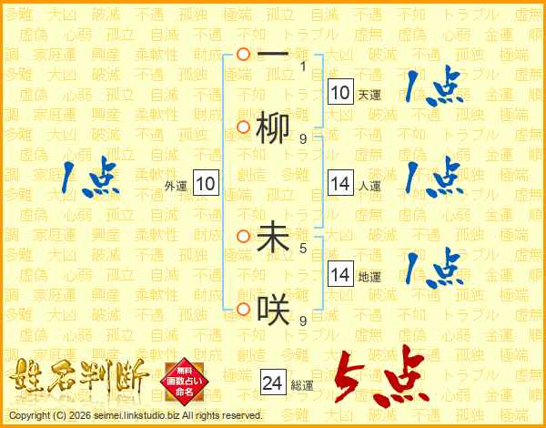 生活面を象徴する運勢です。外部から受ける影響力を表し、結婚運、家庭運や職場、環境への順応性を表します。総運から人運を引いた画数。姓や名が1文字の場合を除く。