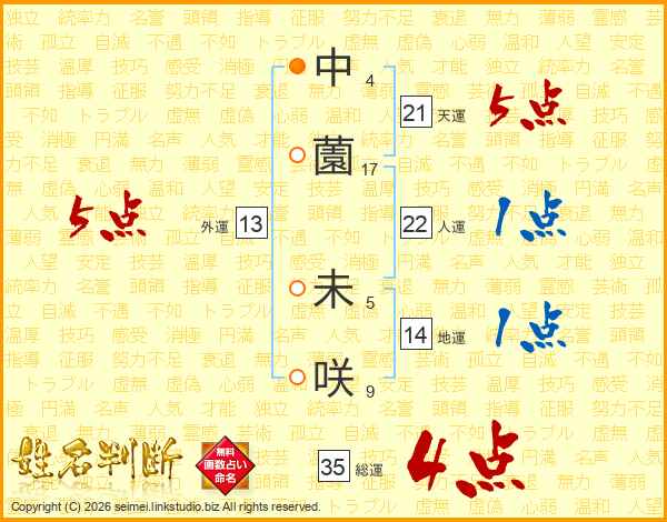 中薗未咲さんの天運は21画の5点!
