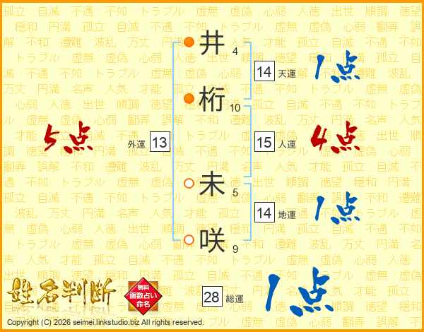 生活面を象徴する運勢です。外部から受ける影響力を表し、結婚運、家庭運や職場、環境への順応性を表します。総運から人運を引いた画数。姓や名が1文字の場合を除く。