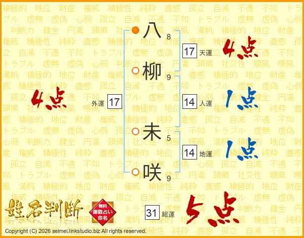 八柳未咲さんの総運は31画の5点!