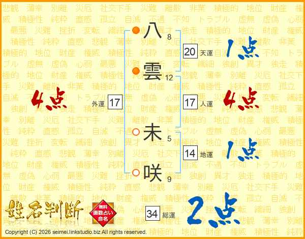 生活面を象徴する運勢です。外部から受ける影響力を表し、結婚運、家庭運や職場、環境への順応性を表します。総運から人運を引いた画数。姓や名が1文字の場合を除く。
