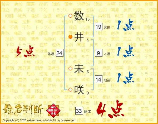 数井未咲さんの総運は33画の4点!