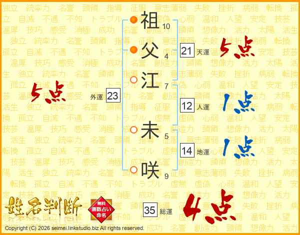 祖(10画)父(4画)江(7画) 未(5画)咲(9画)