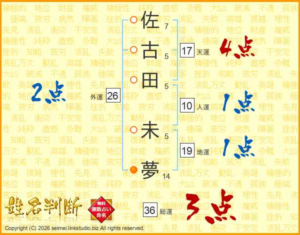 佐(7画)古(5画)田(5画) 未(5画)夢(14画)