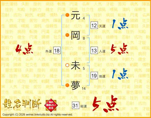 元(4画)岡(8画) 未(5画)夢(14画)
