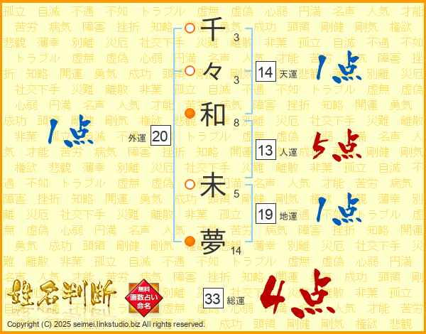 千(3画)々(3画)和(8画) 未(5画)夢(14画)
