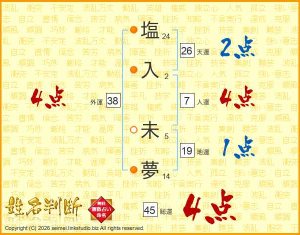 生活面を象徴する運勢です。外部から受ける影響力を表し、結婚運、家庭運や職場、環境への順応性を表します。総運から人運を引いた画数。姓や名が1文字の場合を除く。