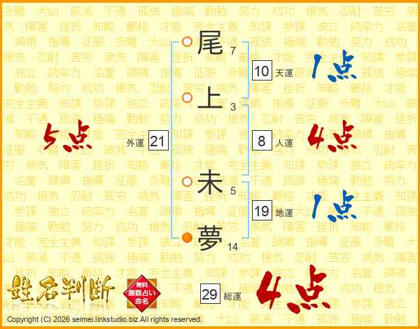 生活面を象徴する運勢です。外部から受ける影響力を表し、結婚運、家庭運や職場、環境への順応性を表します。総運から人運を引いた画数。姓や名が1文字の場合を除く。