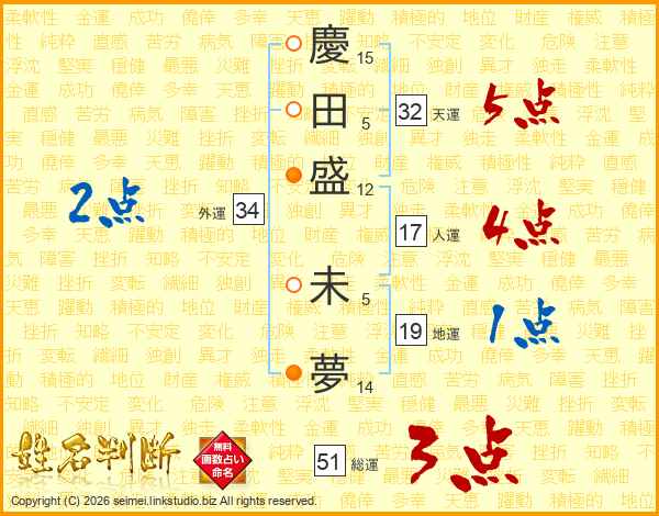 慶(15画)田(5画)盛(12画) 未(5画)夢(14画)