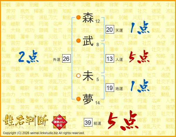 あなたの人生を表す1番重要な運勢です。生涯を通じて影響する総合運となり、主に50歳以降の晩年期に影響を及ぼします。苗字と名前の合計画数。