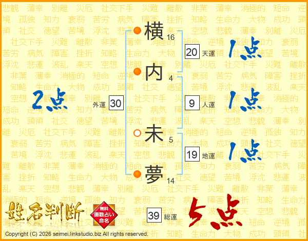 生活面を象徴する運勢です。外部から受ける影響力を表し、結婚運、家庭運や職場、環境への順応性を表します。総運から人運を引いた画数。姓や名が1文字の場合を除く。