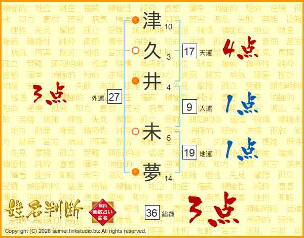 津(10画)久(3画)井(4画) 未(5画)夢(14画)