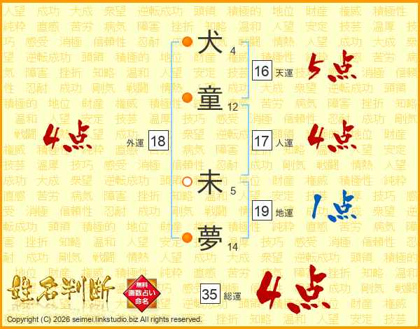 生活面を象徴する運勢です。外部から受ける影響力を表し、結婚運、家庭運や職場、環境への順応性を表します。総運から人運を引いた画数。姓や名が1文字の場合を除く。