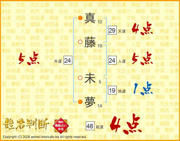 あなたの人生を表す1番重要な運勢です。生涯を通じて影響する総合運となり、主に50歳以降の晩年期に影響を及ぼします。苗字と名前の合計画数。