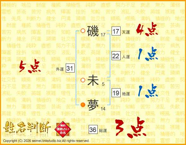 生活面を象徴する運勢です。外部から受ける影響力を表し、結婚運、家庭運や職場、環境への順応性を表します。総運から人運を引いた画数。姓や名が1文字の場合を除く。