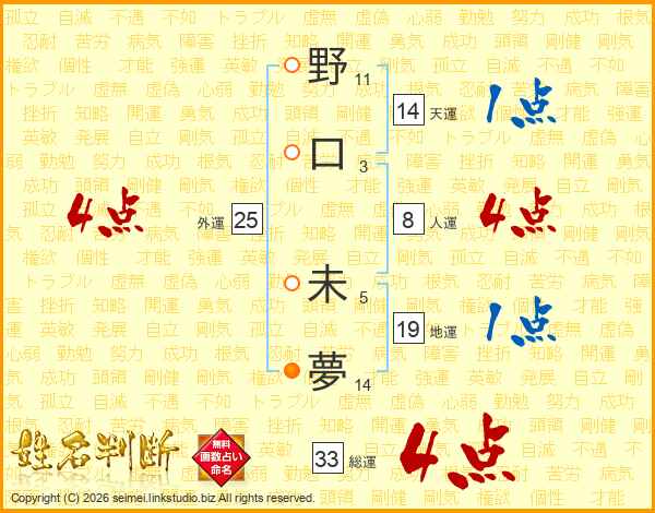 野口未夢さんの総運は33画の4点!