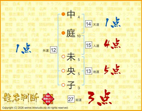 中(4画)庭(10画) 未(5画)央(5画)子(3画)