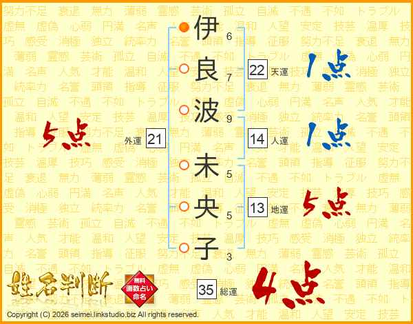 伊(6画)良(7画)波(9画) 未(5画)央(5画)子(3画)