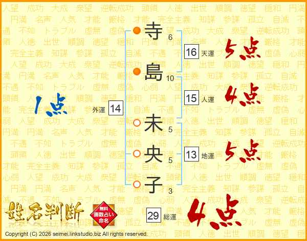 寺(6画)島(10画) 未(5画)央(5画)子(3画)