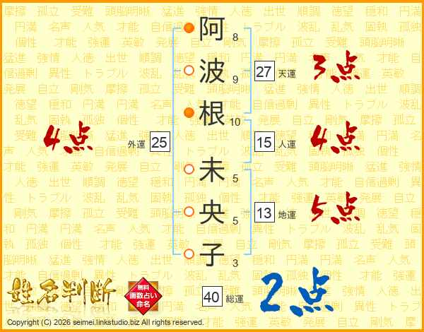阿(8画)波(9画)根(10画) 未(5画)央(5画)子(3画)
