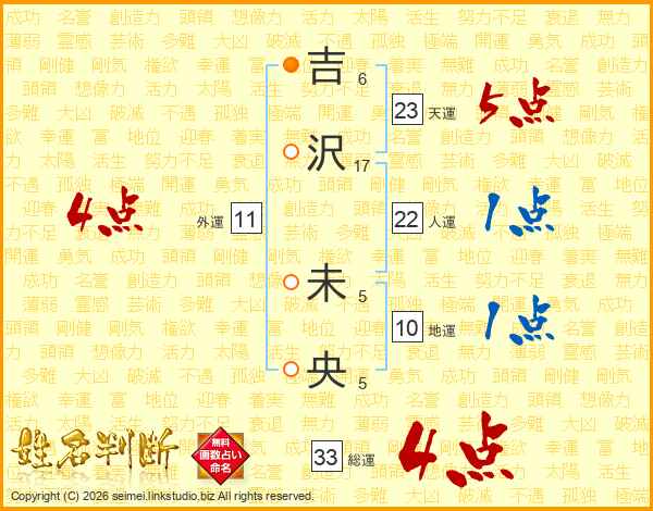吉(6画)沢(17画) 未(5画)央(5画)