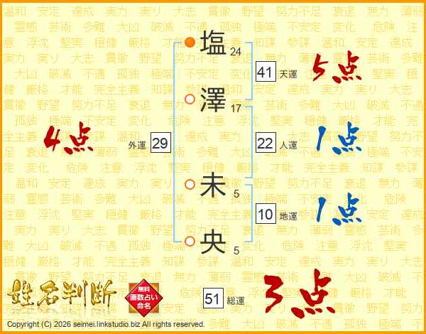 塩(24画)澤(17画) 未(5画)央(5画)