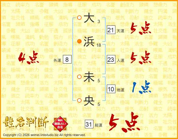 あなたの人生を表す1番重要な運勢です。生涯を通じて影響する総合運となり、主に50歳以降の晩年期に影響を及ぼします。苗字と名前の合計画数。