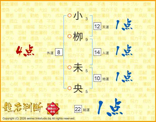 小栁未央さんの総運は22画の1点!
