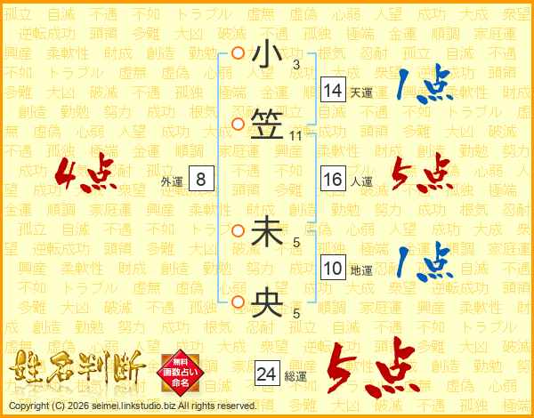 生活面を象徴する運勢です。外部から受ける影響力を表し、結婚運、家庭運や職場、環境への順応性を表します。総運から人運を引いた画数。姓や名が1文字の場合を除く。