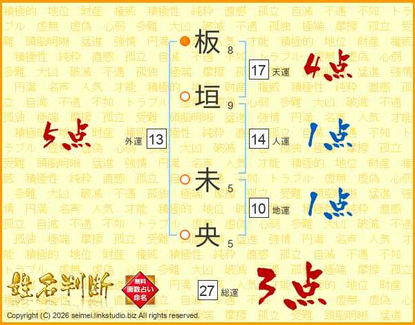 生活面を象徴する運勢です。外部から受ける影響力を表し、結婚運、家庭運や職場、環境への順応性を表します。総運から人運を引いた画数。姓や名が1文字の場合を除く。