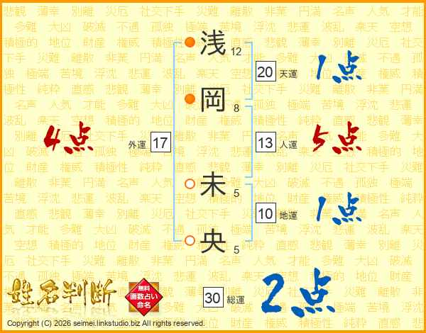 生活面を象徴する運勢です。外部から受ける影響力を表し、結婚運、家庭運や職場、環境への順応性を表します。総運から人運を引いた画数。姓や名が1文字の場合を除く。