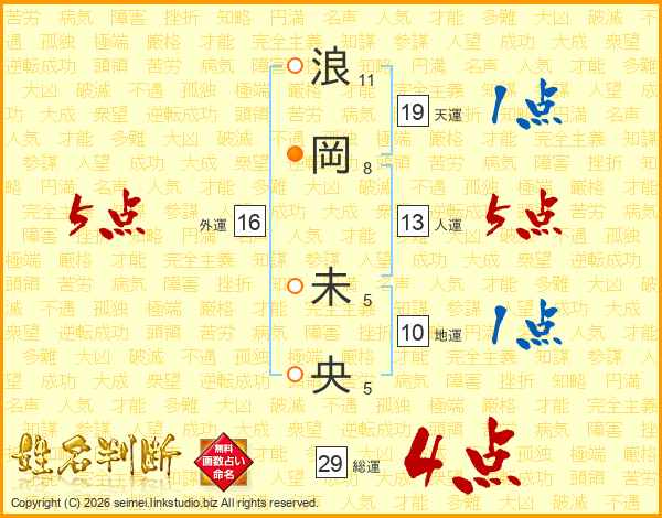 生活面を象徴する運勢です。外部から受ける影響力を表し、結婚運、家庭運や職場、環境への順応性を表します。総運から人運を引いた画数。姓や名が1文字の場合を除く。
