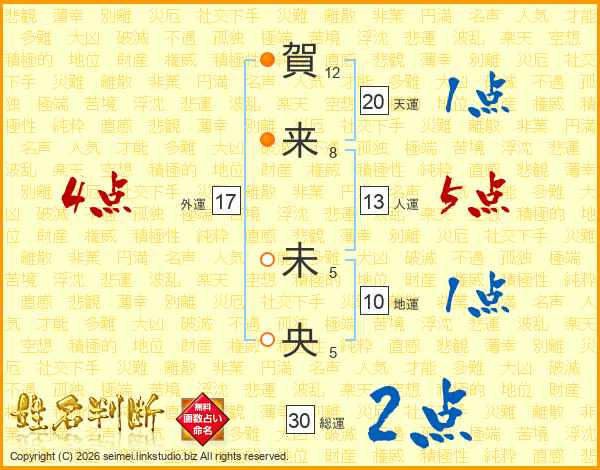 賀(12画)来(8画) 未(5画)央(5画)